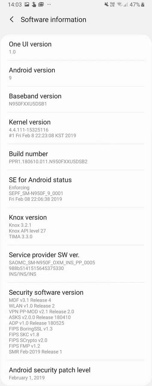 La mise à jour stable est fournie avec la version logicielle N950FXXU5DSB2 et inclut le correctif de sécurité de février 2019 (qui était également disponible sur la version bêta). Nous installons la mise à jour sur notre Note 8 au moment où nous écrivons ces lignes, donc nous aurons bientôt des informations sur les nouveautés ou les changements dans la version stable. Samsung ne nous donne pas un journal des modifications approprié, donc nous supposons qu’il n’est probablement pas différent de la dernière version bêta et qu’il ne servira qu’à changer la version du logiciel.