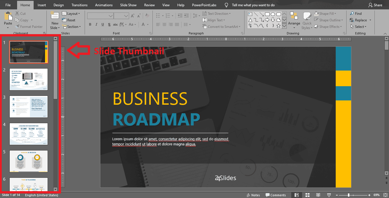 À gauche, défile la liste des diapositives sous forme de miniatures. Cette colonne permet de visualiser l’ensemble du diaporama, de sauter d’une page à l’autre, de réorganiser l’ordre, ou de supprimer ou dupliquer une slide en un clic droit.