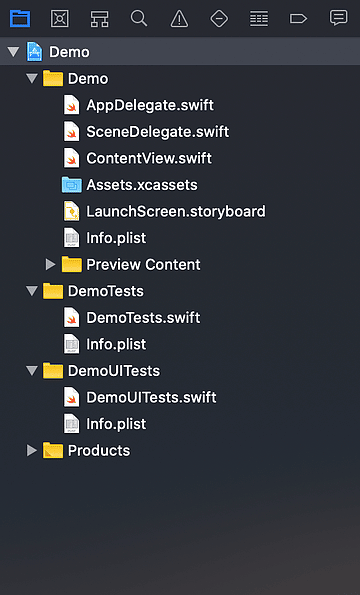 La zone Navigator facilite la navigation dans votre projet et l’organisation de vos fichiers. Par défaut, le « Project Navigator » est sélectionné : il affiche l’ensemble des fichiers de l’application. Plus votre app grossit, plus le nombre de fichiers grimpe, pensez à utiliser les « groupes » (équivalent des dossiers) pour classer tout ce petit monde. L’organisation visuelle dans Xcode n’impacte pas la logique du code ou le fonctionnement de l’app.